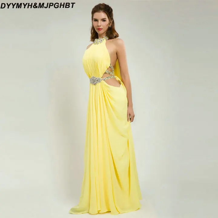 Sexy Yellow Prom Dresses Cut-out Waisst with Crystal Halter Floor Lentgh Front Slit Prom Gowns